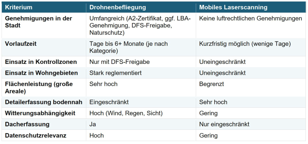 Die Kurzfassung: Gerade in städtischen Gebieten entscheidet nicht allein die Technik, sondern vor allem das Genehmigungsrecht darüber, welche Methode tatsächlich zum Einsatz kommen kann. Wir erklären, warum wir in Potsdam und dem Berliner Umland auf mobiles Laserscanning setzen – und wann die Drohne trotzdem die bessere Wahl ist.